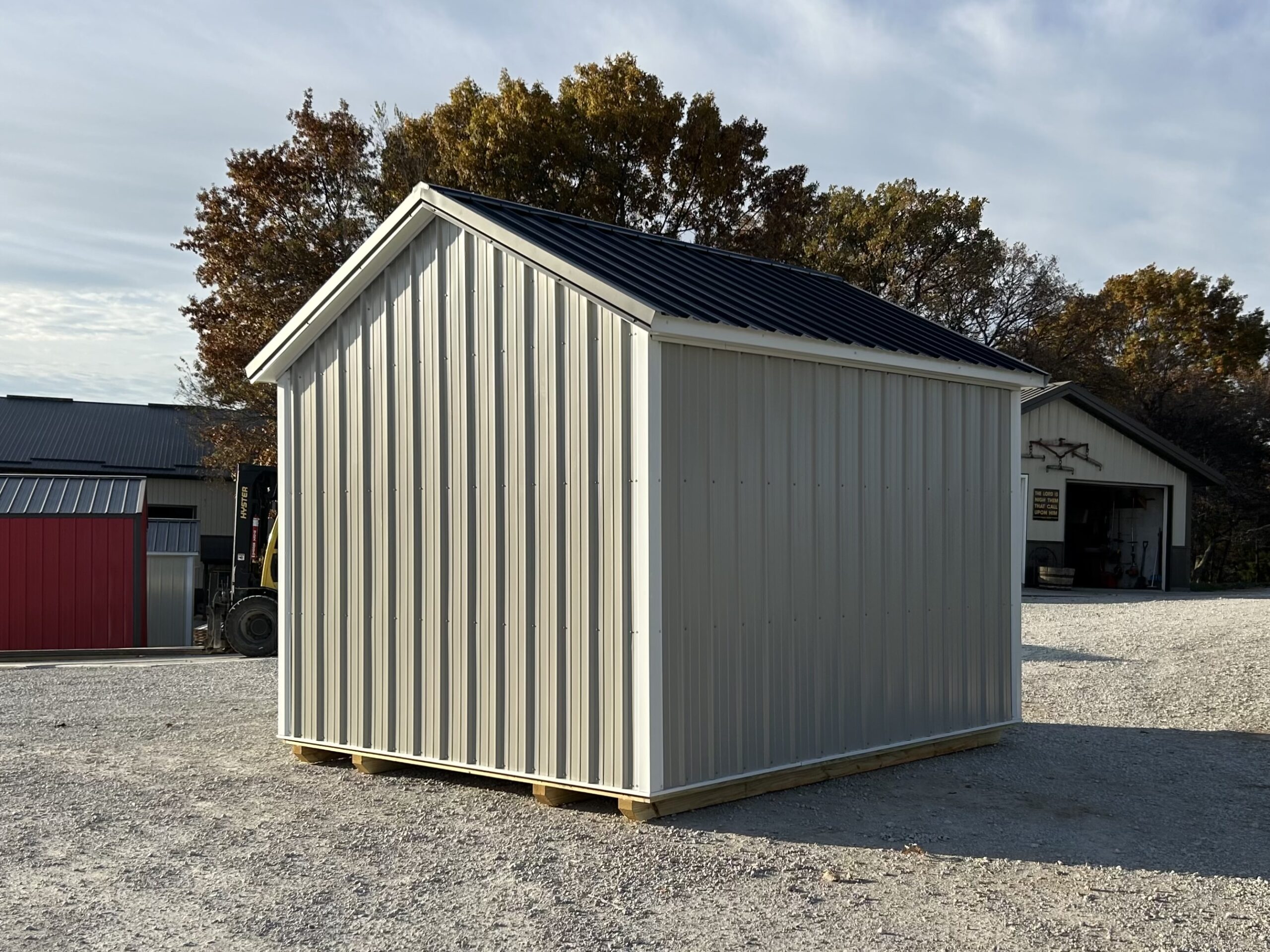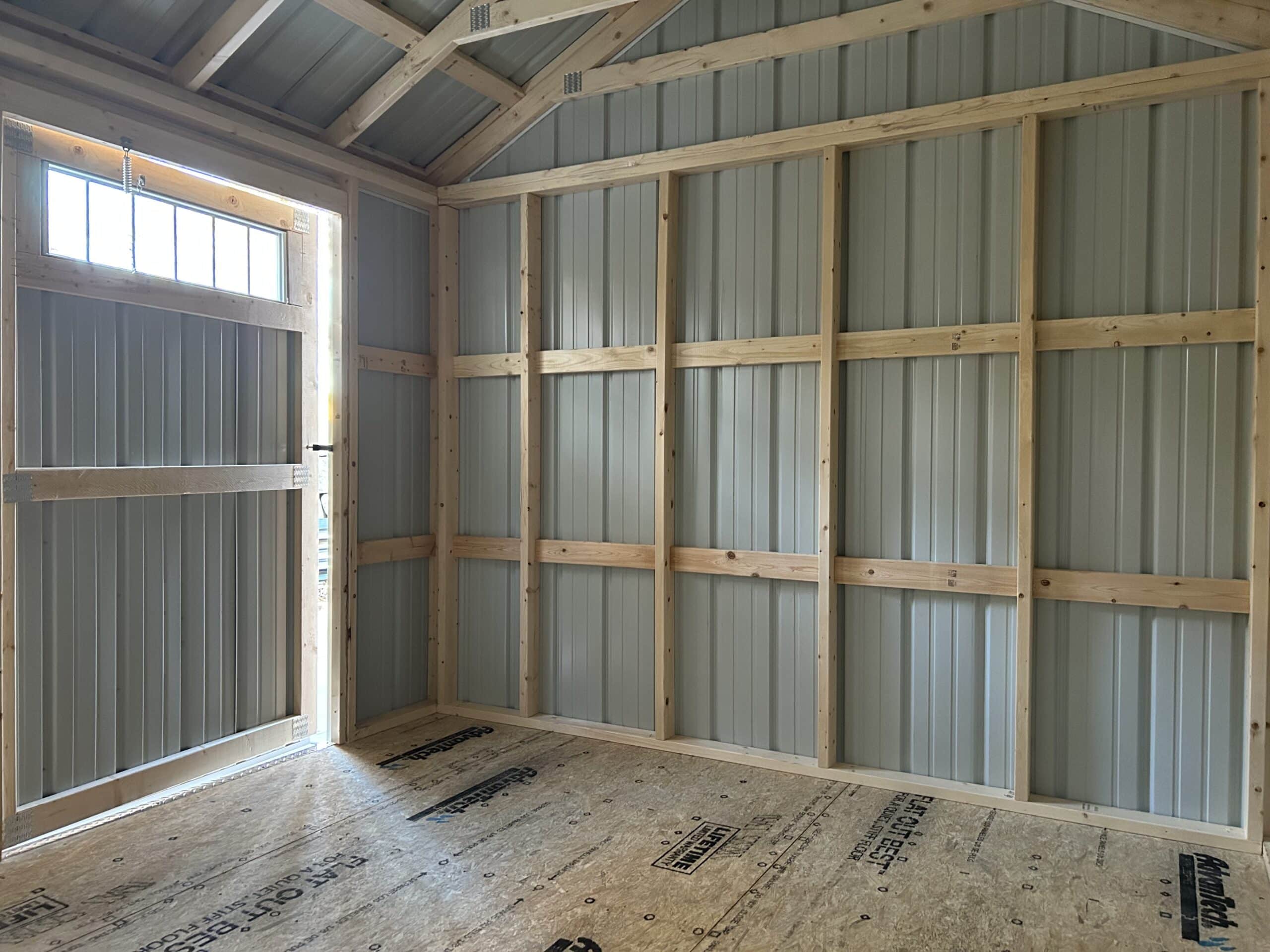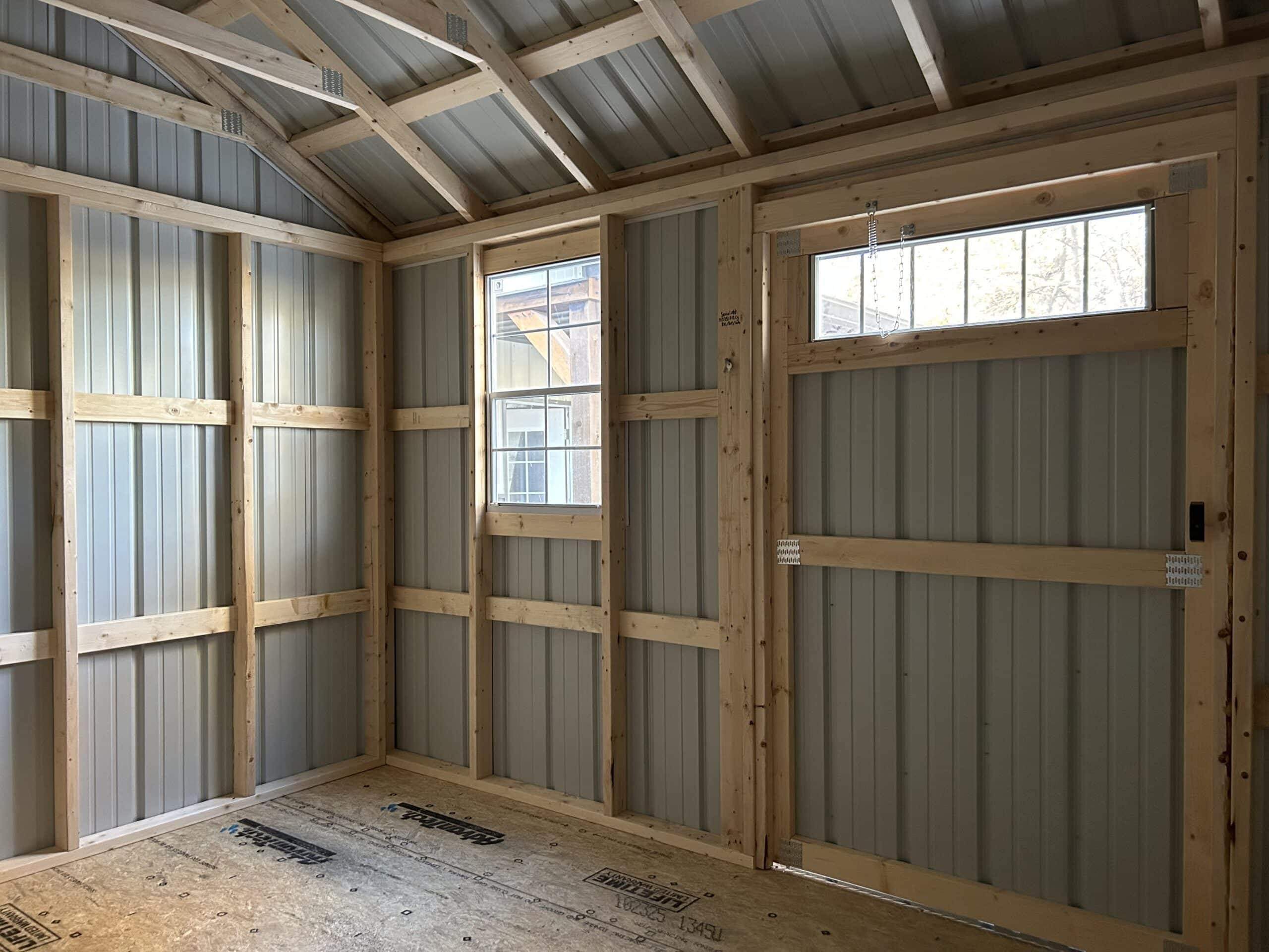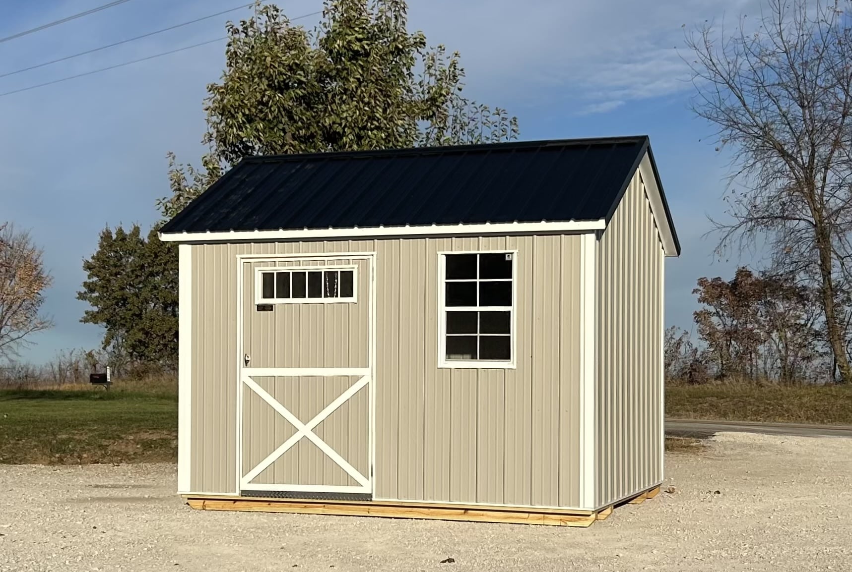 10×12 Cottage shed featuring 48″ Single door w/ Transom and a 24×36 window. 7′ Walls and 5″ overhangs included!